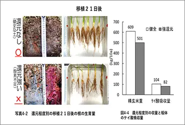 還元が進んで強還元状態になると、イネにダメージを与え、さらに還元が進むと、根を傷める有機酸や硫化水素が発生し(「ワキ」の発生)、
