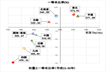 高温障害による影響が全国に広がっており、関東以西などは収量および一等米比率ともに低い値となっています。