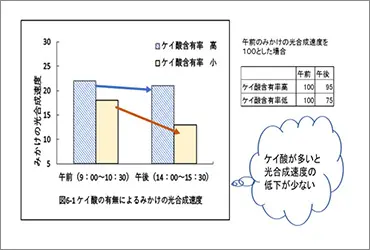 生理的には、ケイ酸施用により光合成能が向上して糖やアミノ酸といった一次代謝物質の生成が増加し、そこからストレスに対応した二次代謝物質が生成されます。